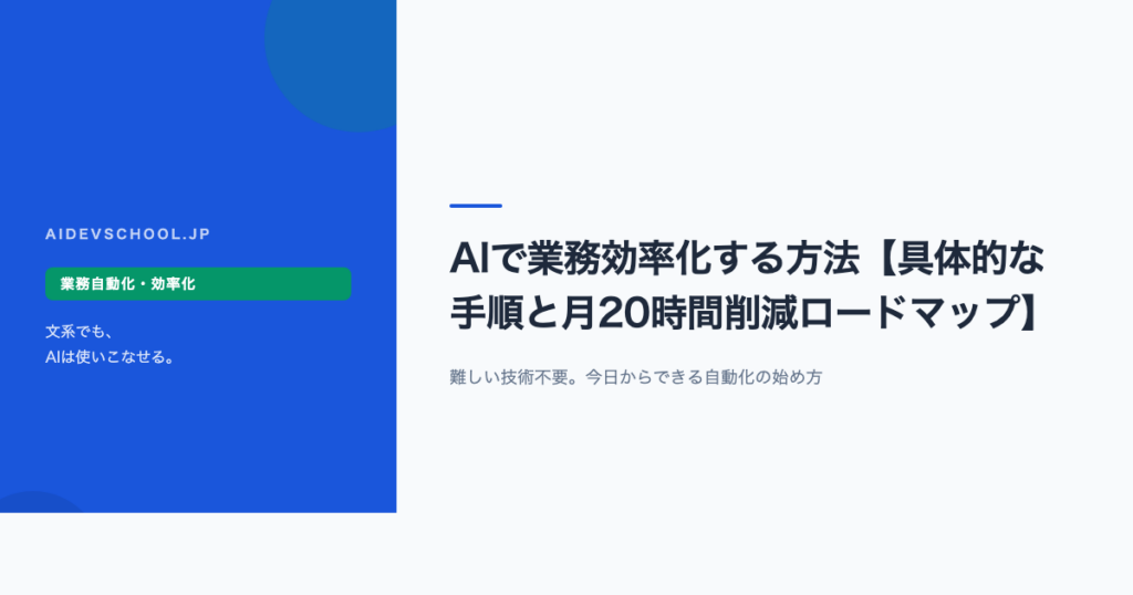 AIで業務効率化するとは、「毎日の繰り返し作業をAIに任せること」です。難しい技術は不要。ChatGPT・Notion AI・Claude——今すぐ使えるAIツールで、月20〜40時間の業務時間を削減できます。この記事では具体的な手順と事例を解説します。 AIで業務効率化で... -