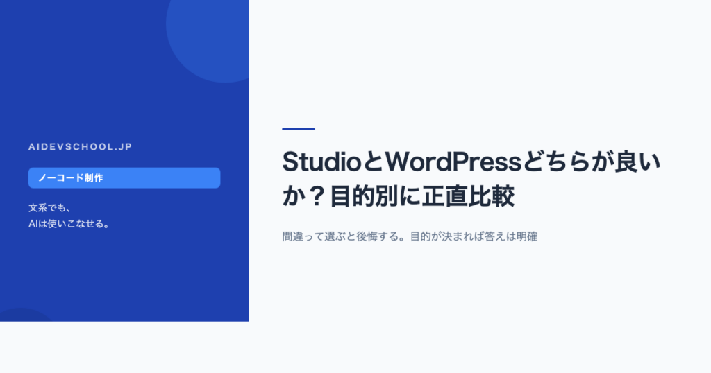 StudioとWordPressは「同じWebサイト作成ツール」ではありません。向いている用途が明確に違い、間違って選ぶと後悔します。この記事では目的別に「どちらを選ぶべきか」を正直に比較します。 StudioとWordPressの根本的な違いは何か? Studioは「デザイン... -